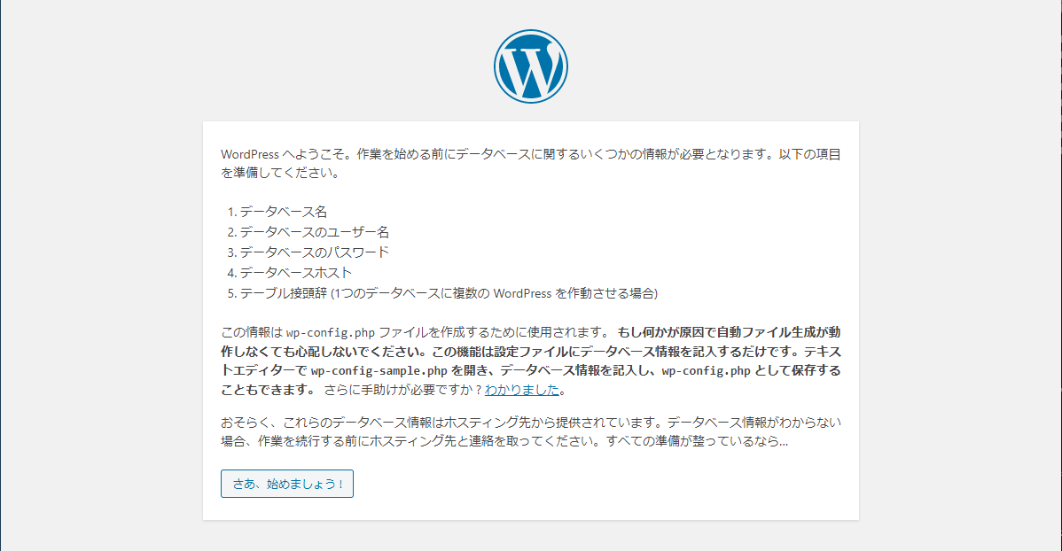 DBの設定が済んでいないので[さあ、始めましょう!]はしません。